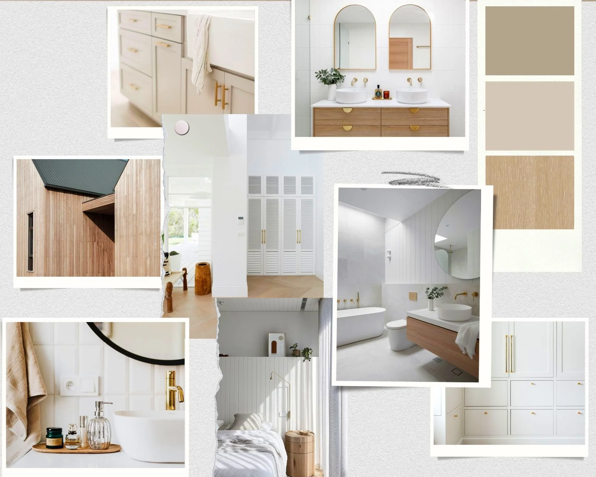 The design theme revolves around a coastal aesthetic, focusing on texture with louvered interior doors, scissor truss ceilings adorned with beams, and paneling in the separate lounge and primary bedroom. To maintain the coastal vibe in the bathrooms and kitchen, brass fittings were integrated alongside hardiegroove walls to avoid an overly clinical all-white palette. For the kitchen, the choice leaned towards the elegant Lana Grey by Dezignatek, steering away from the conventional white kitchen.